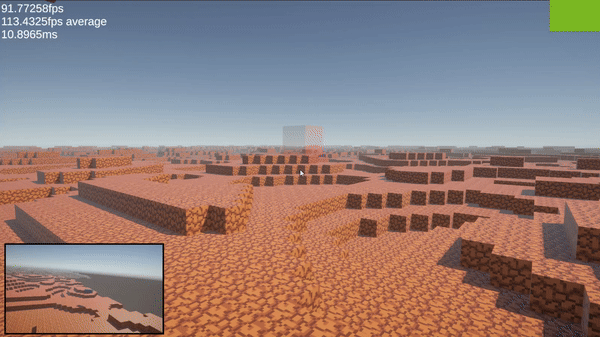This problem was made slightly easier to solve due to the new voxel system. Chunks are arranged in such away that they are effectively created within a fixed grid around the player. Each chunk exists in an array with an index that can be used to calculate its position relative to the player. Using this, a fixed-size array and 3D texture can be created that will be guaranteed to encompass the entire world around the viewpoint based on a given chunk view distance. Then, whenever a chunk is initiallized or modified, a section of the array is updated. Finally, every frame, if that array has been updated it is applied to the 3D texture which can be used by the GPU. I somewhat expected this to be catastrophic for performance, since whenever the player moves to another chunk the entire world 'shifts' around them which would in turn update the entire texture, however fortunately it proved to be pretty much fine; copying data from one array to a different array is not that expensive, the expensive operation is actually applying the changes to the texture, but that is only ever done maximum once per frame, no matter how much changes.