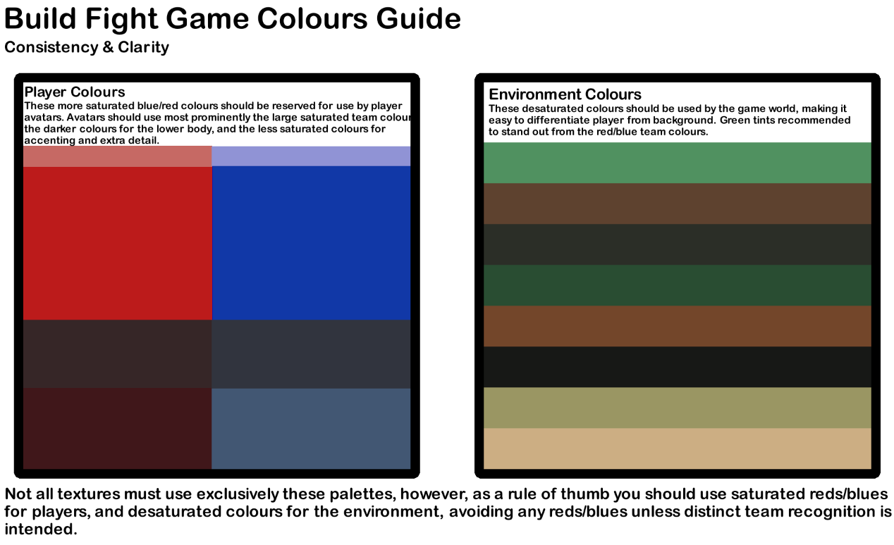 not a competitive one, having a tightly-designed and fair experience is still important. Crucial to that is being able to recognize players from their environment. Since all the player models use saturated block-colours, the first step to devising a new visual language for BFG was to consider colour. I took inspiration from TF2, a game in which team and player recognition was a major design goal and everything in the game reinforces that (at least in 2007, whether that holds true today is another debate). I created a colour palette to draw from which assigned the most saturated blues and reds to player models, and had a few distinct desaturated environment colours. This was to be the baseline for the new design.
