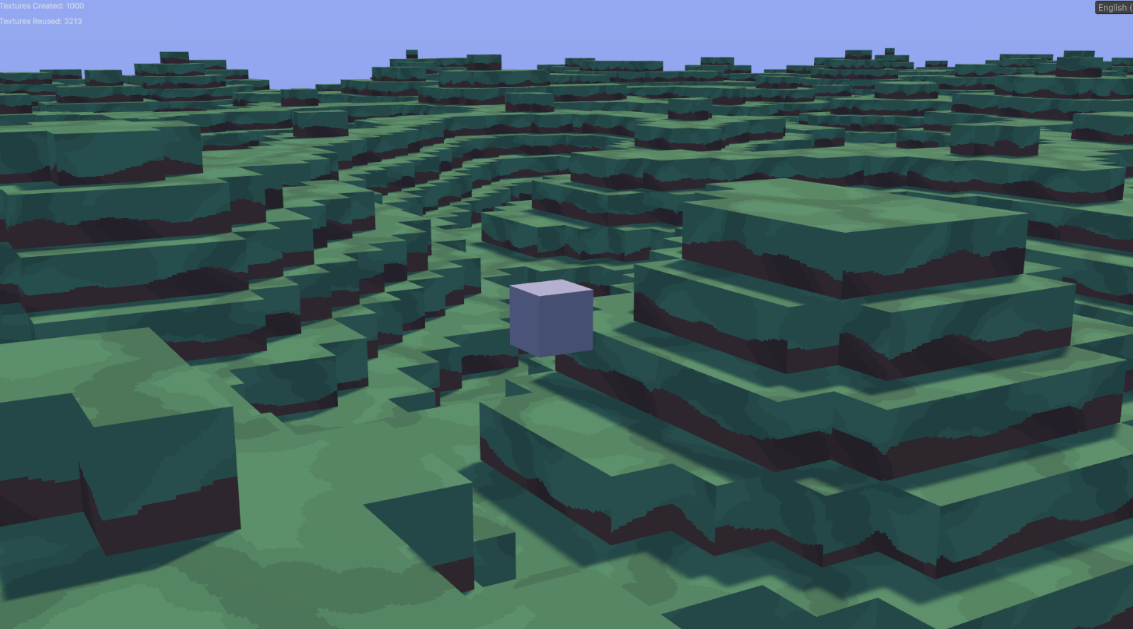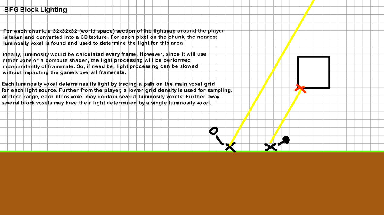 This fixed-around-the-viewpoint chunk system also means that there will only ever be a fixed number of luminosity textures at each resolution. This has been a massive performance saver, as by using an object pooling system it is guaranteed that there will be an available texture for each chunk that can just be reset (a relatively inexpensive operation) rather than creating an entirely new texture (which caused very noticable framedrops when generating new chunks).