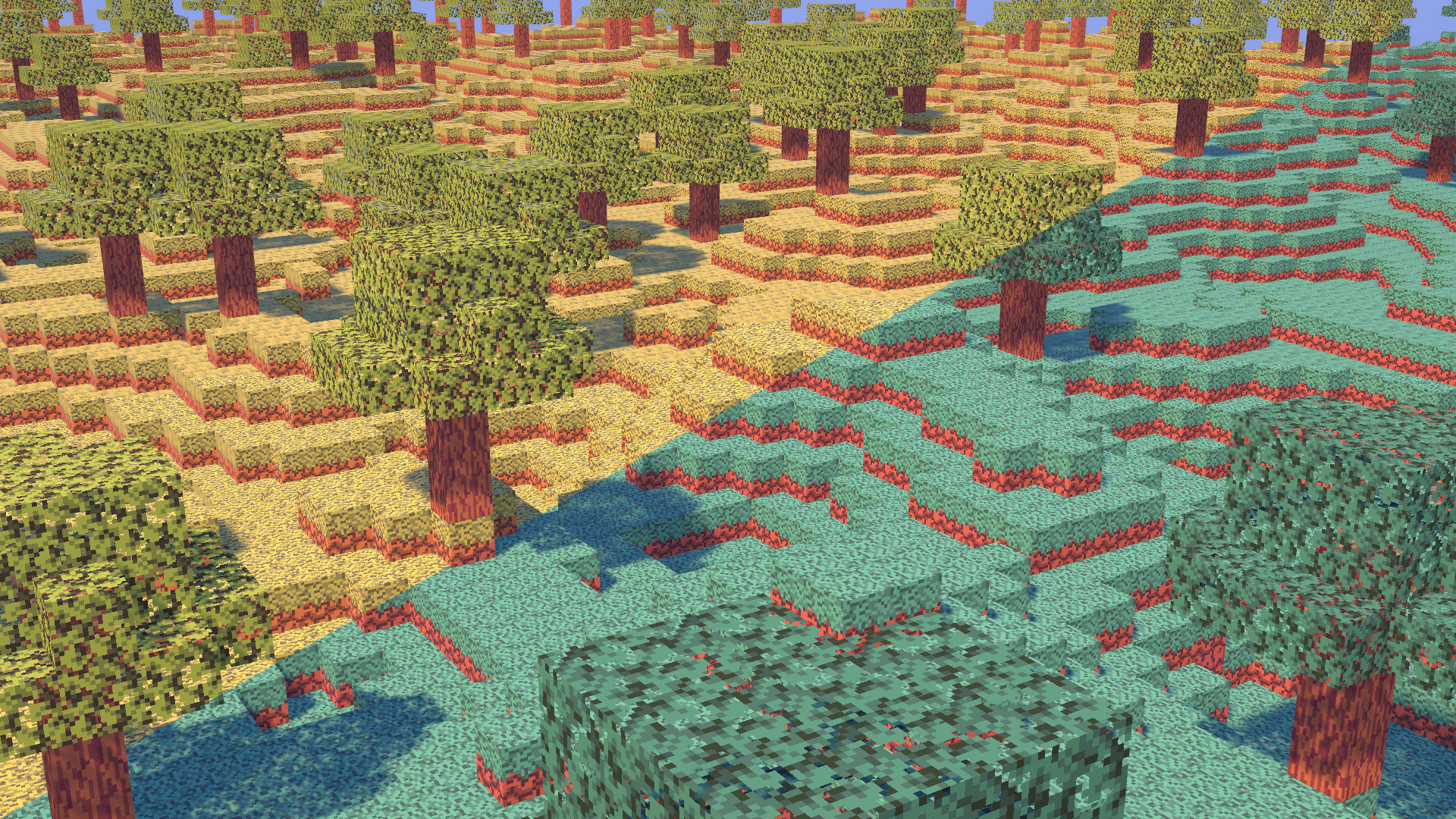 Trees! This wasn't really something that I ever actually intended to add from the start, thinking that the grass planes would serve fine as a battleground. However, I had to create a structure system anyway for spawning each team's vault into the world. While developing this, I needed to test it so filled the world with trees stone dicks. At this point, I was only a couple blocks away from just having trees, and I found the world looked a lot more interesting when it wasn't completely barren. All I needed was textures for the wood/leaves.